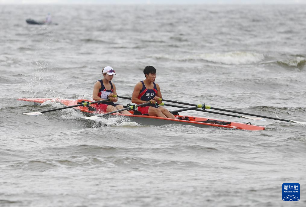 8月15日,福建队选手苏诗雅(左)/林伟锋在成年组混合双人双桨计时赛比赛中。最终,他们以2分53秒93的成绩晋级四分之一决赛。