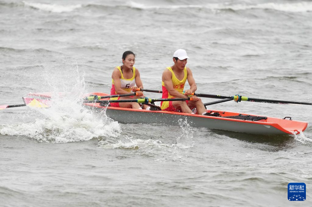 8月15日,山东队选手张玉婷/李庆堯在成年组混合双人双桨计时赛比赛中。最终,他们以2分53秒68的成绩晋级四分之一决赛。