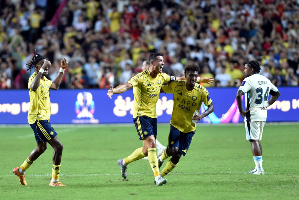 8月19日,利雅得胜利队球员克·罗纳尔多(左二)与队友庆祝进球。新华社发(卢炳辉摄)