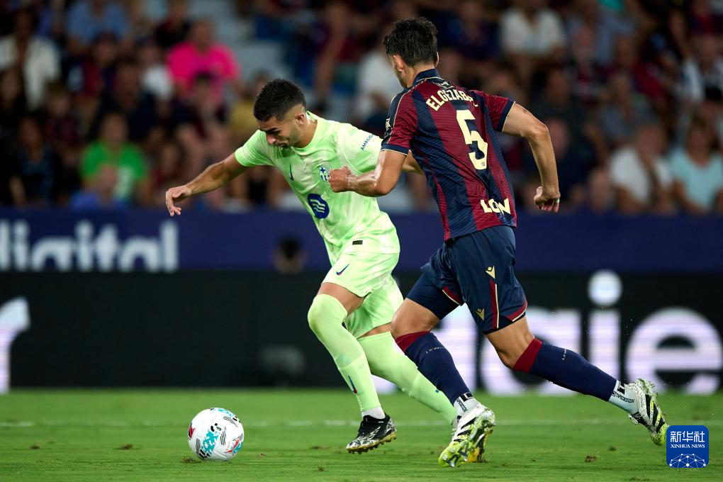 8月23日,巴塞罗那队球员费兰·托雷斯(左)与莱万特队球员埃尔赫萨瓦尔在比赛中拼抢。