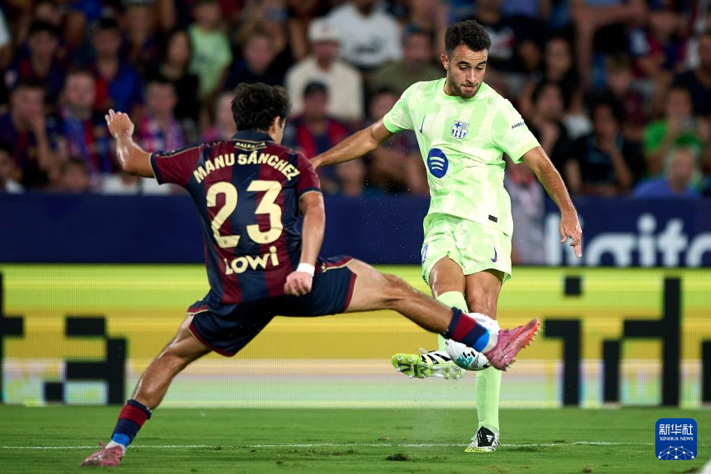 8月23日,巴塞罗那队球员埃里克·加西亚(右)与莱万特队球员马努·桑切斯在比赛中拼抢。