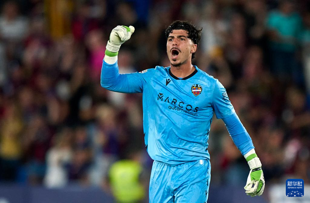 8月23日,莱万特队守门员库尼亚特在比赛中庆祝球队进球。