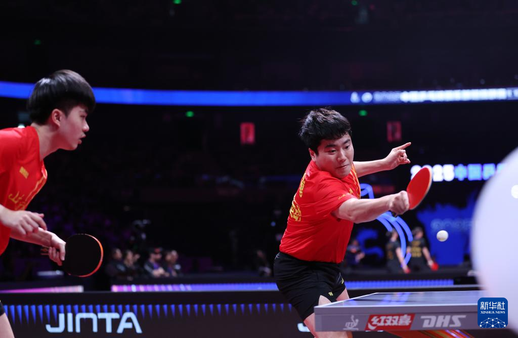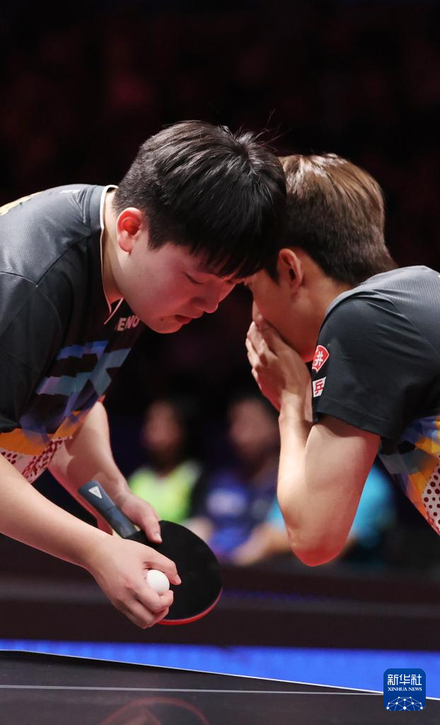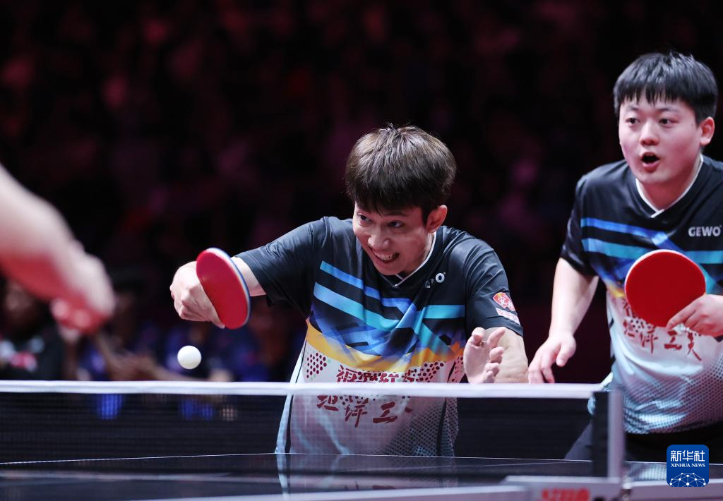 8月29日,山东魏桥·向尚运动队组合林昀儒/梁靖崑(右)在比赛中。他们在双打比赛中3比0战胜中超电缆·福建安井队组合宋卓衡/梁俨苧。