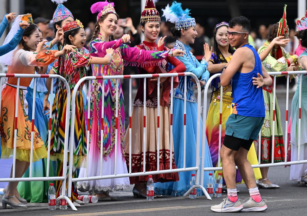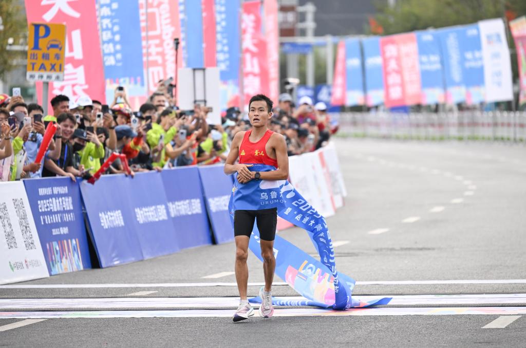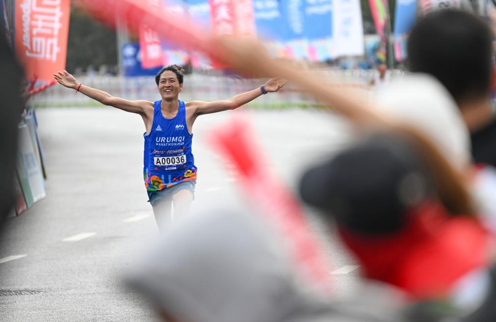 8月31日,中国选手多斯包勒·哈布利江恩在比赛中。最终,他以2小时25分33秒的成绩获得男子全程马拉松亚军。