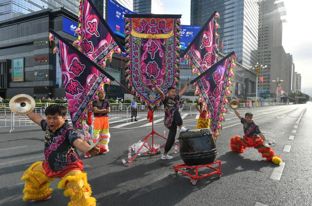 8月31日,舞狮队演员在比赛中为参赛选手呐喊助威。