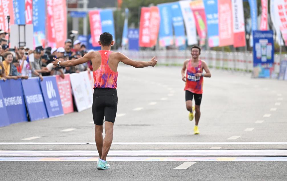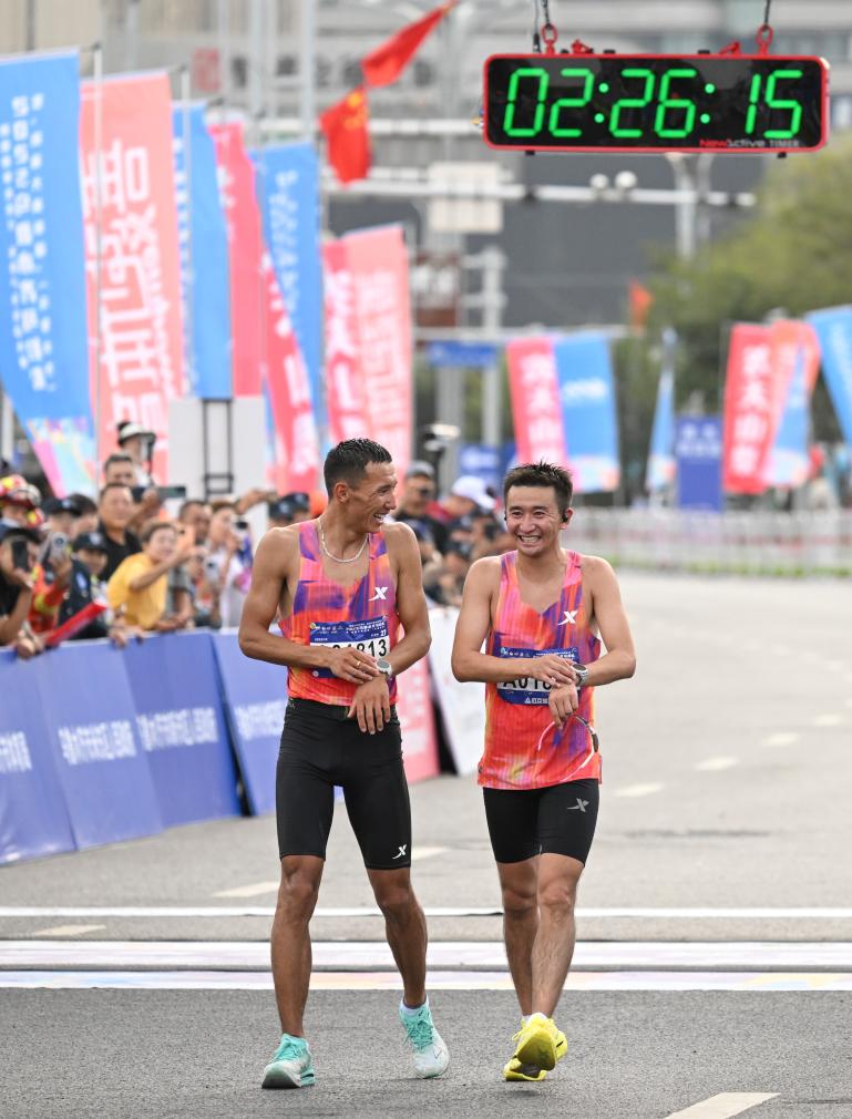 8月31日,中国选手多斯包勒·哈布利江恩(左)在终点处迎接好友巴合塔尔·吾拉孜艾力。最终,两人分别以2小时25分33秒和2小时26分09秒的成绩获男子全程马拉松亚军、季军。