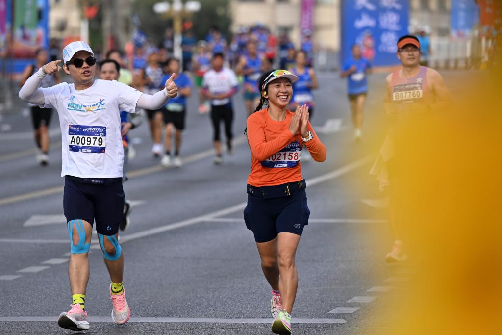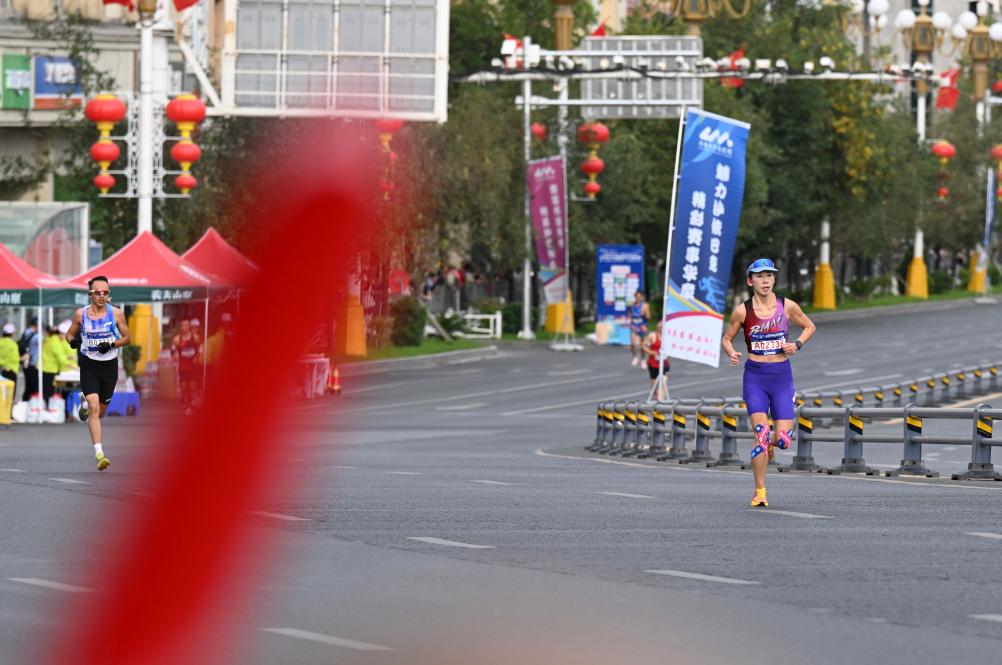 8月31日,中国选手敖苹平(右)在比赛中。最终,她以2小时50分18秒的成绩获得女子全程马拉松亚军。