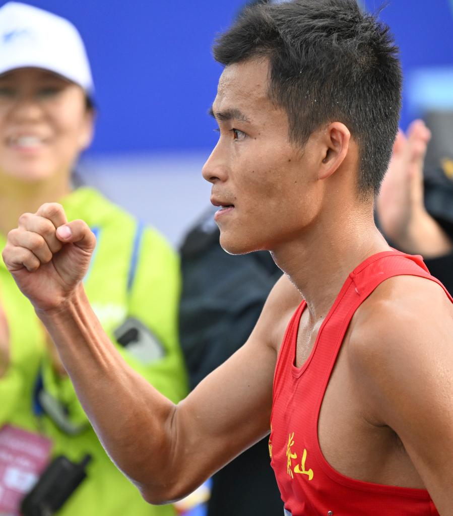 8月31日,男子全程马拉松冠军李政跃在比赛后庆祝。