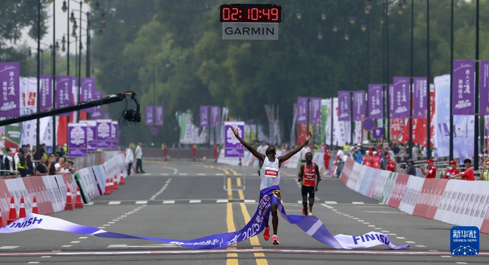8月31日,肯尼亚选手昂查理(前)冲过终点。他获得马拉松男子组冠军。