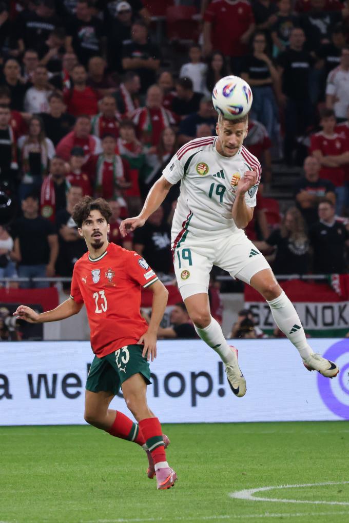 9月9日,匈牙利队球员沃尔高(右)在比赛中争顶。新华社发(弗尔季·奥蒂洛摄)