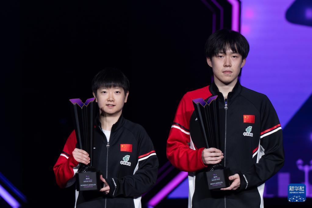 9月14日,男单冠军、中国选手王楚钦(右)和女单冠军、中国选手孙颖莎在颁奖仪式上。
