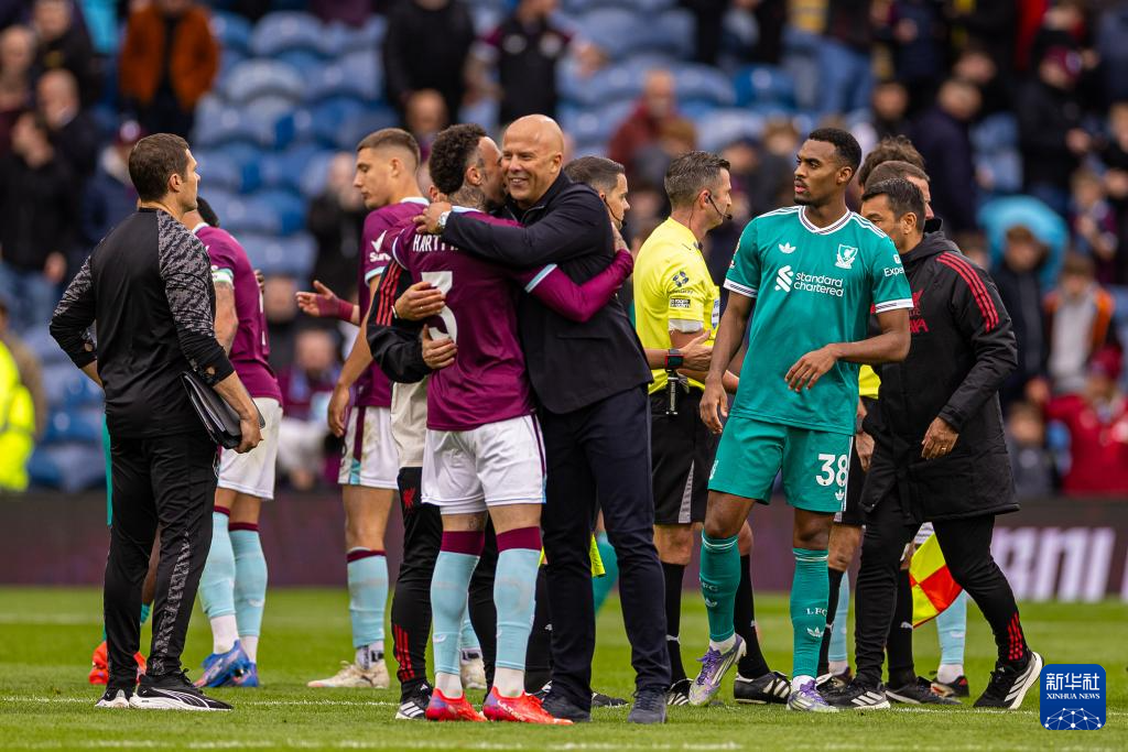 9月14日,利物浦队主教练斯洛特(前右)赛后拥抱伯恩利队球员哈特曼。