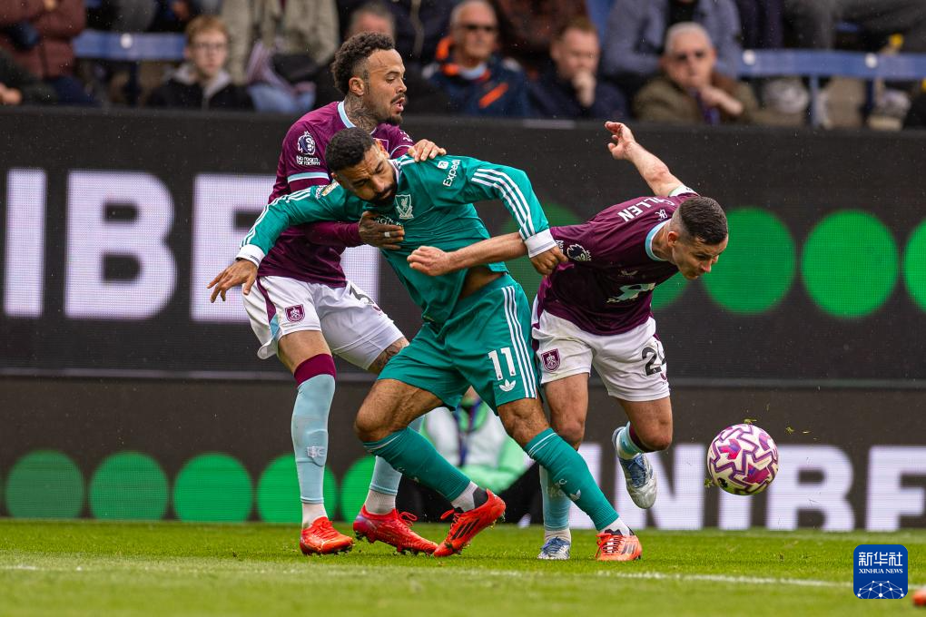 9月14日,利物浦队球员萨拉赫(中)与伯恩利队球员拼抢。