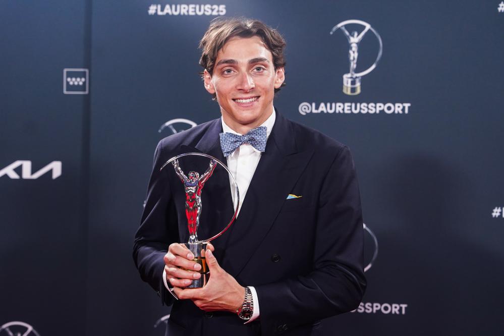 4月21日,获得年度最佳男运动员奖的瑞典撑杆跳高运动员杜普兰蒂斯手捧奖杯留影。当日,2025劳伦斯世界体育奖颁奖典礼在西班牙马德里举行。新华社记者 彭子洋 摄