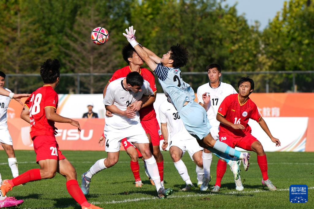 9月18日,北京航空航天大学男足守门员吴思洁(右三)在比赛中扑救。
