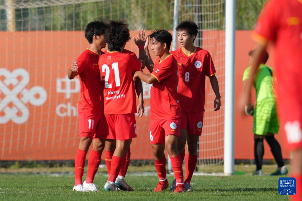 9月18日,北京航空航天大学男足球员程曦阳(右一)在比赛中打进点球后与队友庆祝。