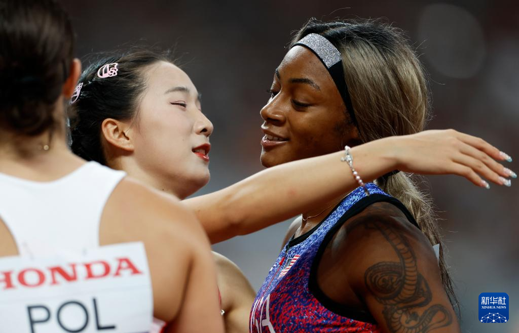9月20日,中国队第四棒选手陈妤颉(左)与美国队第四棒选手理查森在比赛后相互致意。