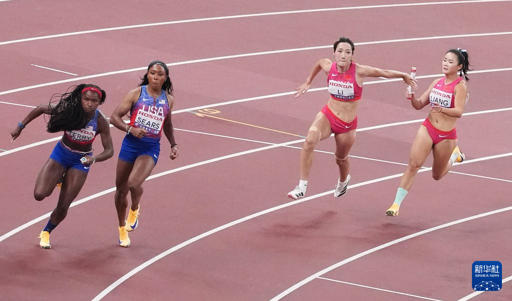 9月20日,中国队第一棒选手梁小静(右一)和第二棒选手李玉婷(右二)在比赛中交接棒。