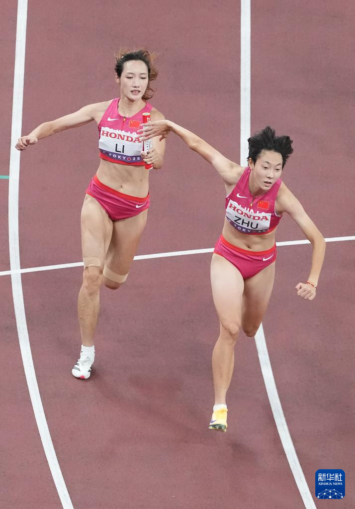 9月20日,中国队第三棒选手朱俊颖(右三)和第四棒选手陈妤颉(右四)在比赛中交接棒。