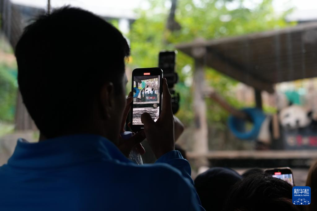9月23日,一名球员在大连森林动物园拍摄大熊猫。