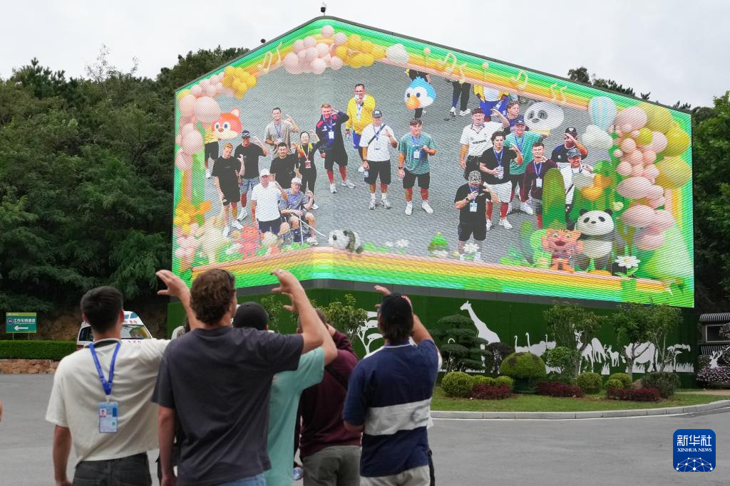 9月23日,球员、教练员、裁判员等在大连森林动物园观看裸眼3D互动大屏。