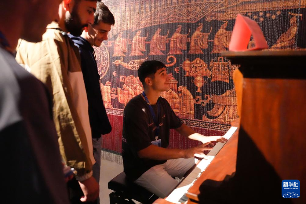 9月23日,一名西班牙格拉纳达大学队球员在世界音乐文化博物馆内弹钢琴。