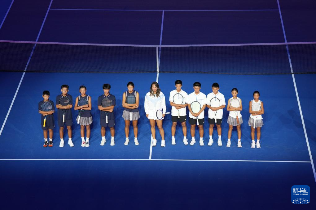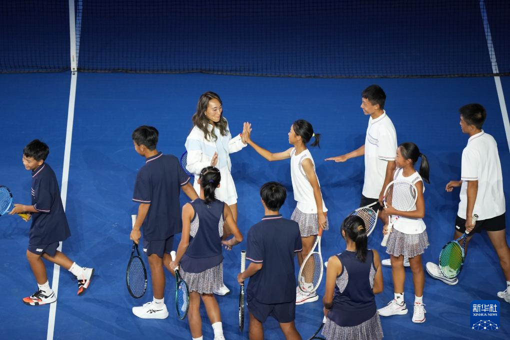 9月23日,中国网球运动员郑钦文(上左三)在活动中与小运动员互动。