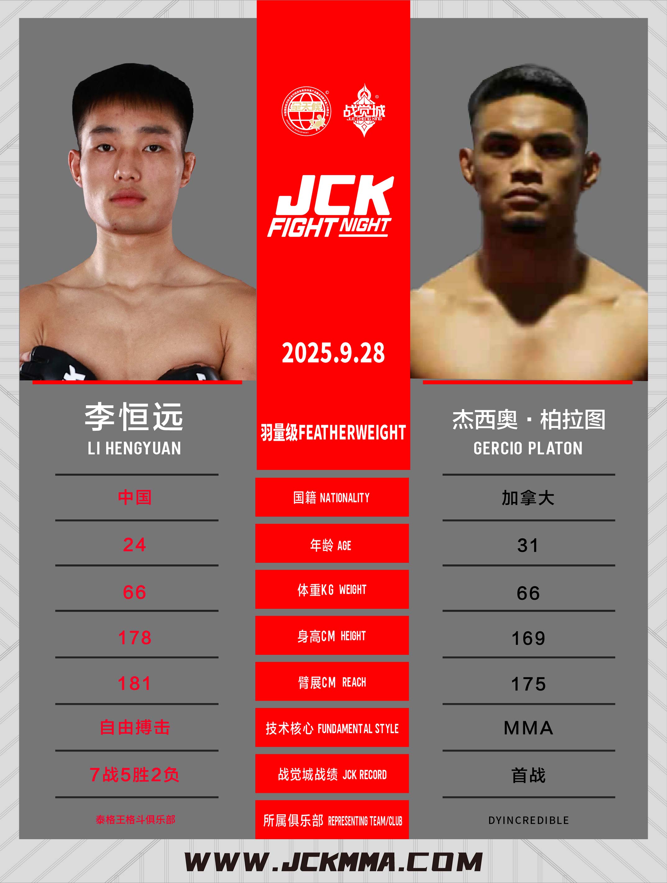 李恒远,以自由搏击为技术核心,在JCK战觉城7战5胜,曾TKO谢伟、彭爽、刘永强,一致判定战胜贾海龙、周肖沸。