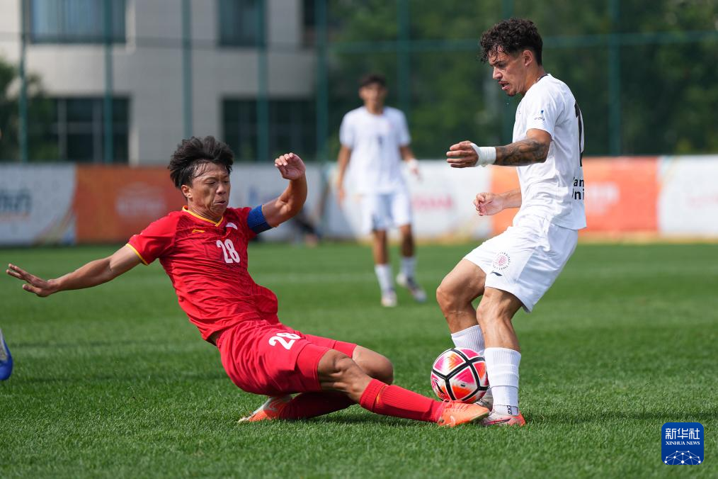 9月26日,拉蒙鲁尔大学男足球员卡斯特利斯(前左)和北京航空航天大学队球员林扬(前右)在比赛中拼抢。