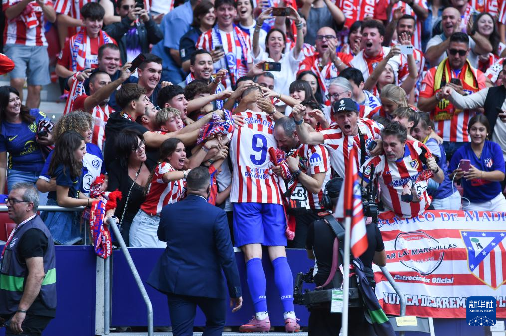 9月27日,马德里竞技队球员庆祝队友勒诺尔芒的进球。