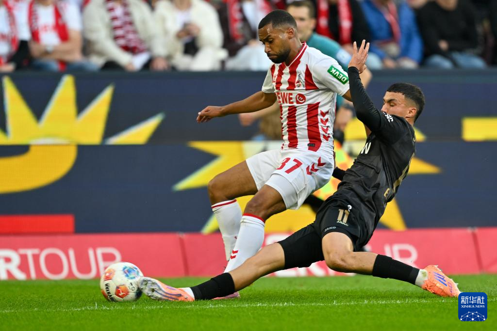 9月28日,科隆队球员蒂尔曼(右)和斯图加特队球员瓦格诺曼在比赛中拼抢。