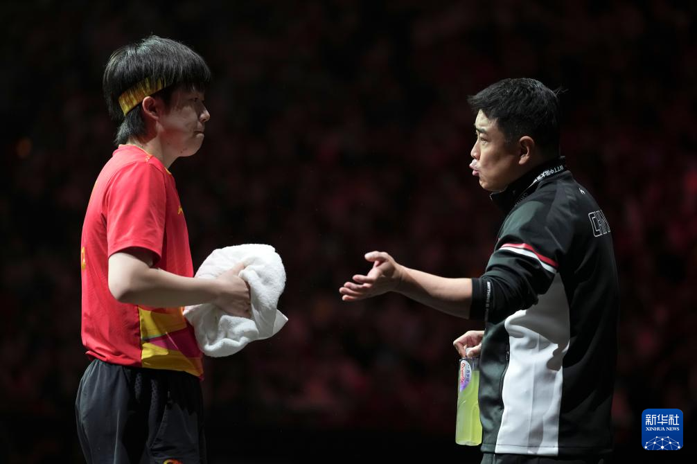 10月1日,王楚钦(左)在比赛中接受教练王皓指导。
