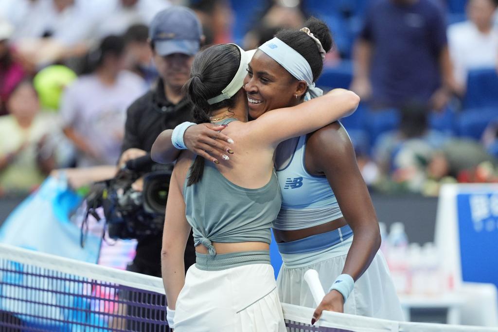 10月2日,高芙(右)与利斯在赛后拥抱致意。新华社记者 谢晗 摄