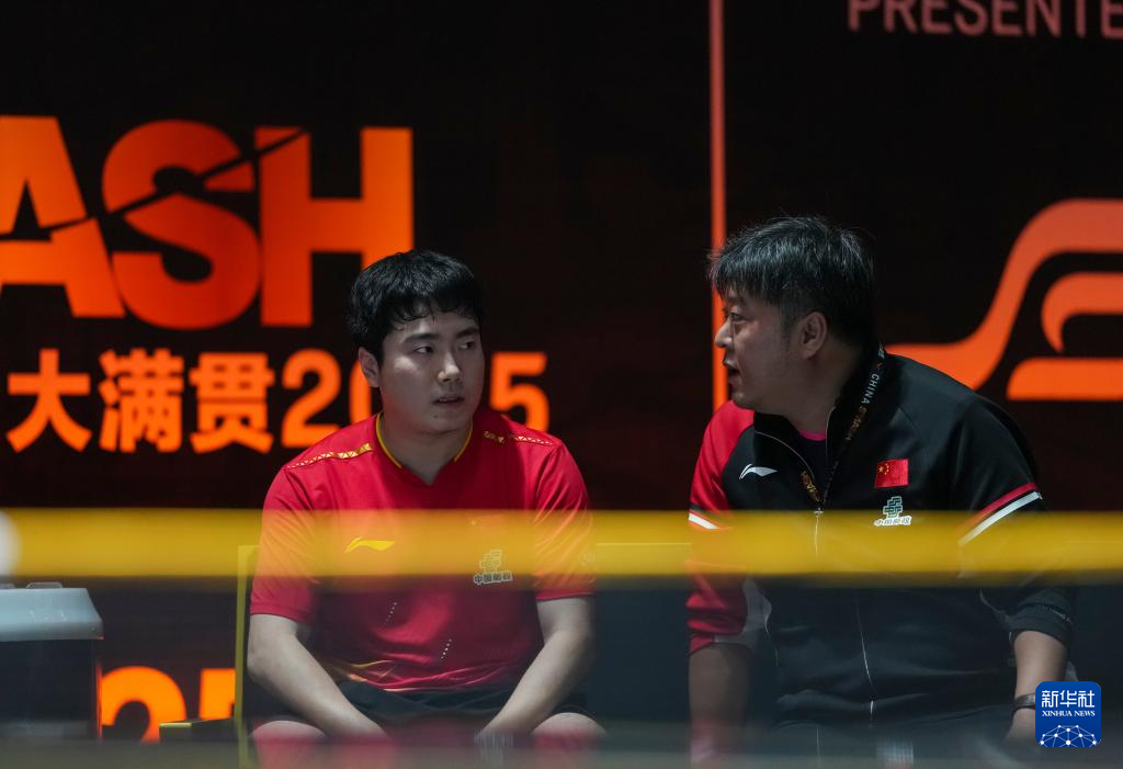 10月2日,梁靖崑(左)在比赛间隙接受教练指导。