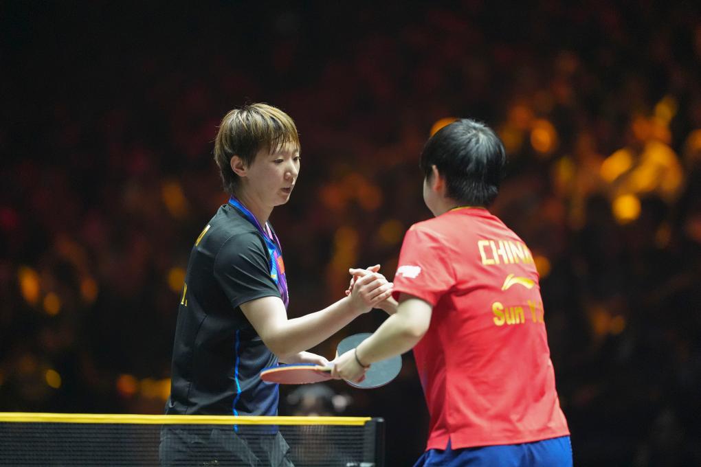 10月5日,王曼昱(左)获胜后与孙颖莎握手致意。新华社记者 谢晗 摄
