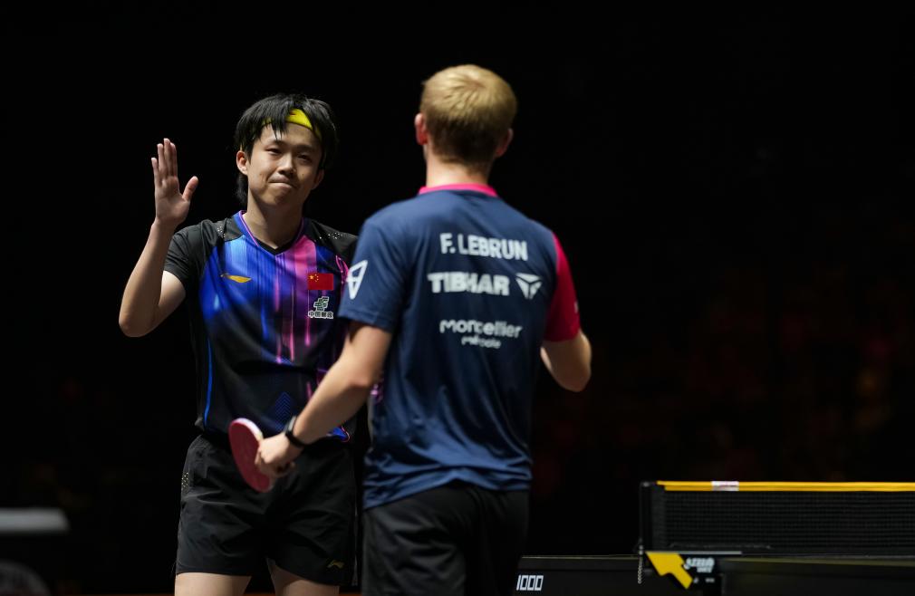 10月5日,王楚钦(左)赛后和勒布伦致意。新华社记者 孙非 摄