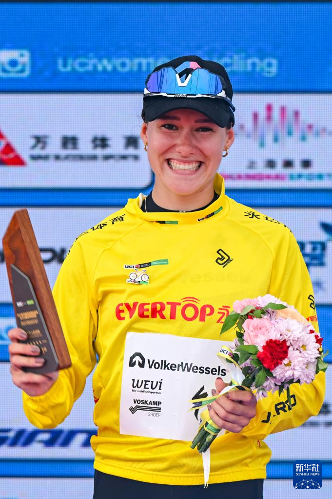 10月16日,BTC城市卢布雅尔那车队哈萨克斯坦车手斯克利亚罗娃身着代表最佳青年车手的白衫在颁奖仪式上庆祝。