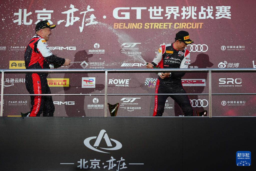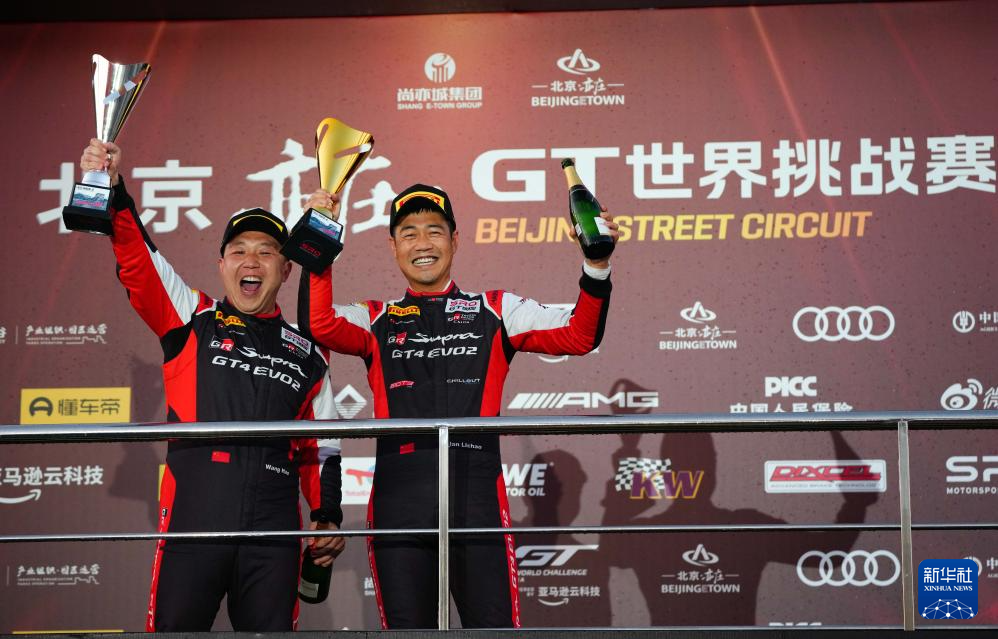 10月19日,本轮比赛Silver组别冠军丰田GAZOO中国车队中国车手韩坜潮(右)与亚军丰田GAZOO中国车队中国车手王浩在颁奖仪式上庆祝。