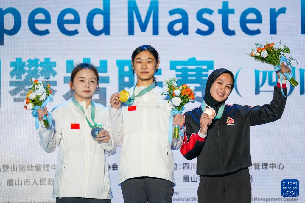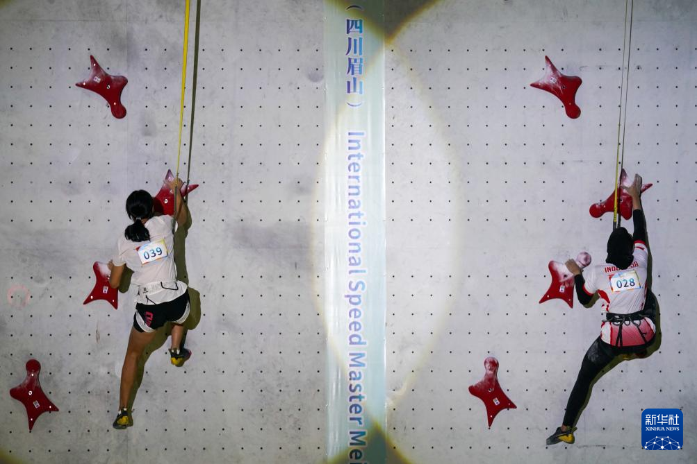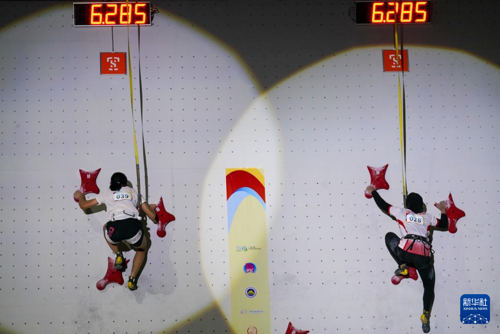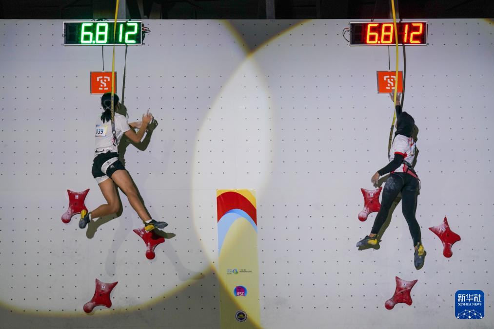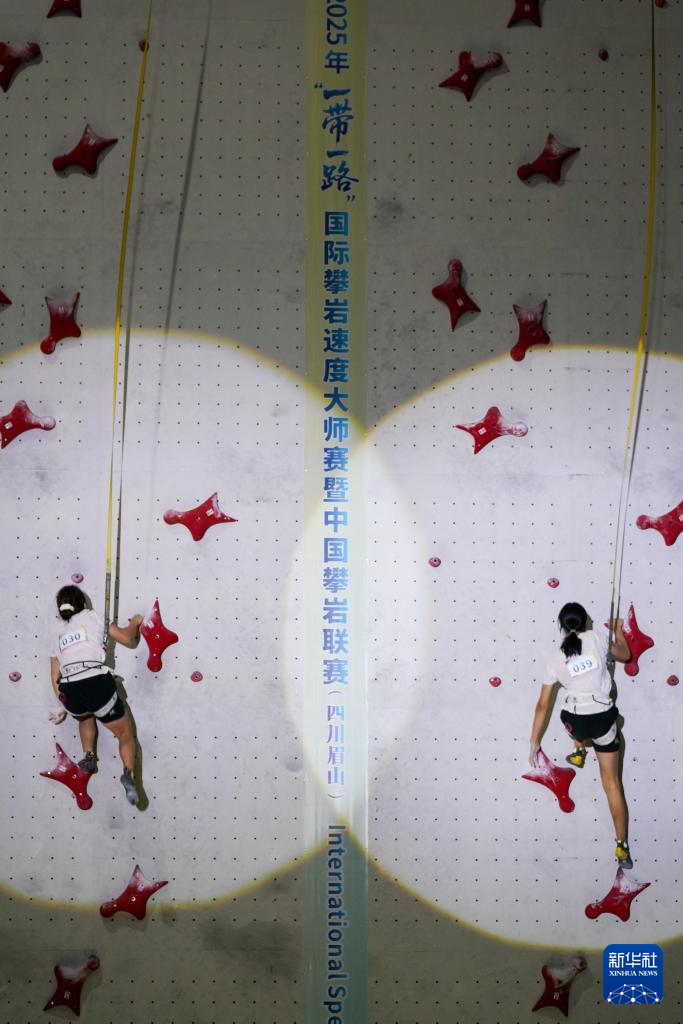 当日,在四川眉山举行的2025年“一带一路”国际攀岩速度大师赛暨中国攀岩联赛(四川眉山站)女子速度赛中,中国选手王宇婷、牟玉菊包揽冠亚军。