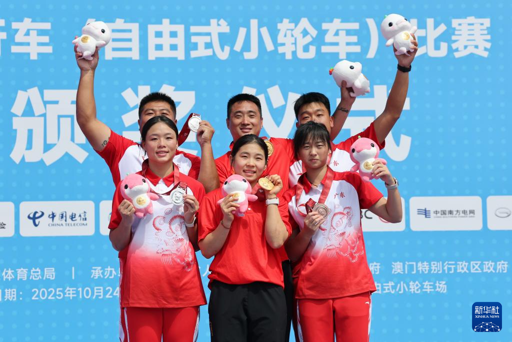 10月25日,冠军河北队选手孙思蓓(前中)、亚军广东队选手范晓桐(前左)、季军广东队选手雷珊珊(前右)和教练们在颁奖仪式上合影。