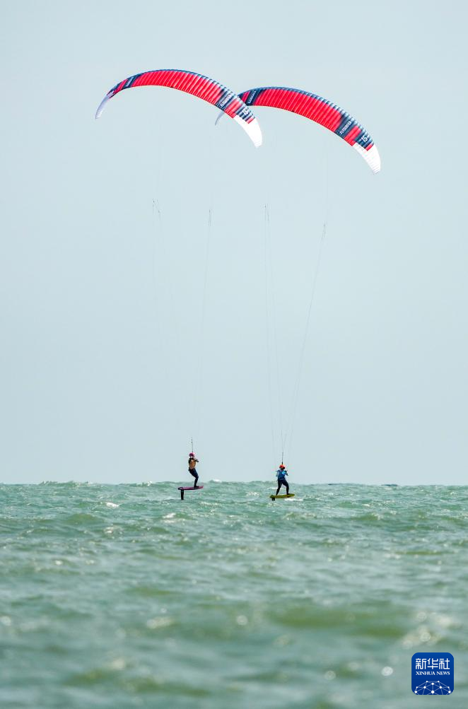 10月30日,上海队选手李婉(右)和广东队选手王思在女子水翼风筝板级比赛中。最终,李婉获得冠军,王思获得亚军。