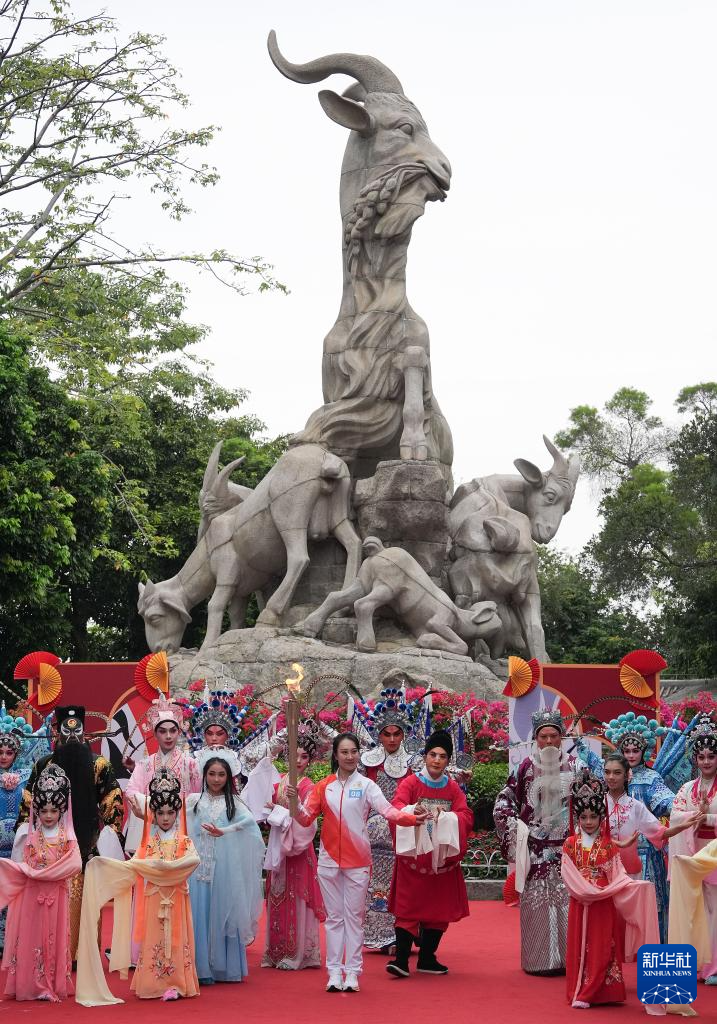 11月2日,火炬手李嘉宜(中)在广州越秀公园内的五羊雕像前传递火炬。