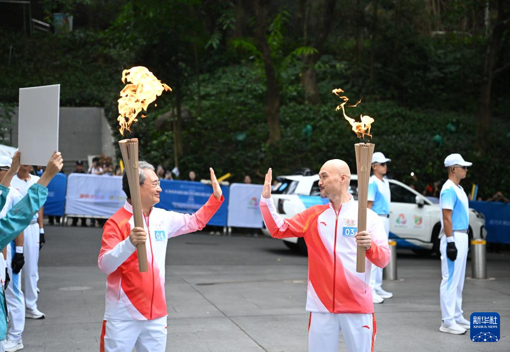 11月2日,火炬手杨景辉(左)、刘伟强在广州博物馆前交接火炬。