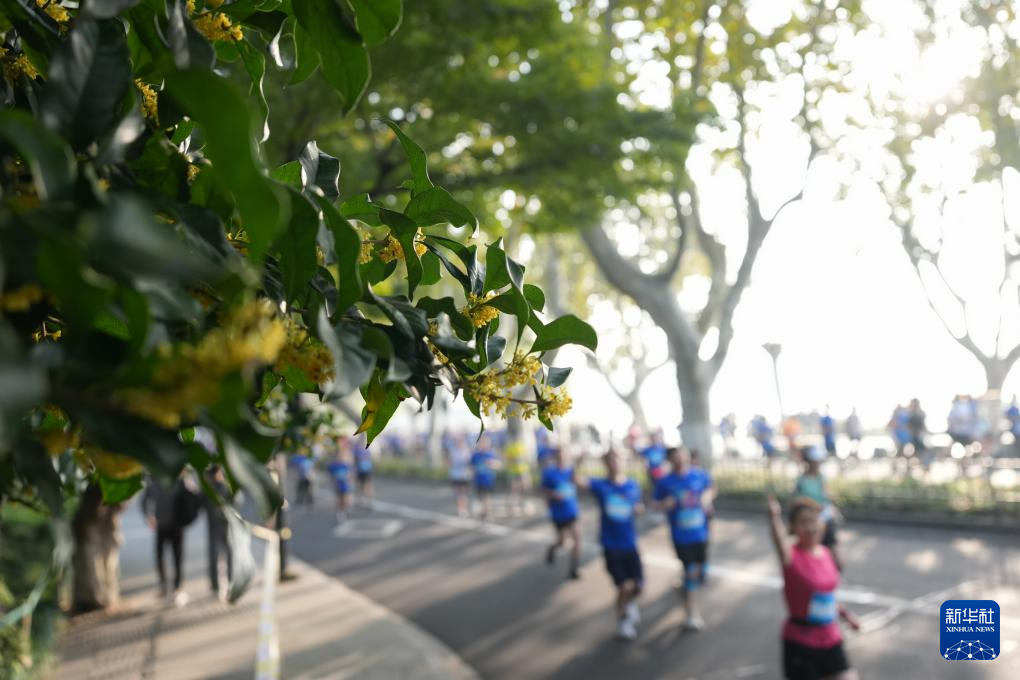 11月2日,参赛选手从西湖景区北山街的桂花树下跑过,此时杭州正值丹桂飘香时。