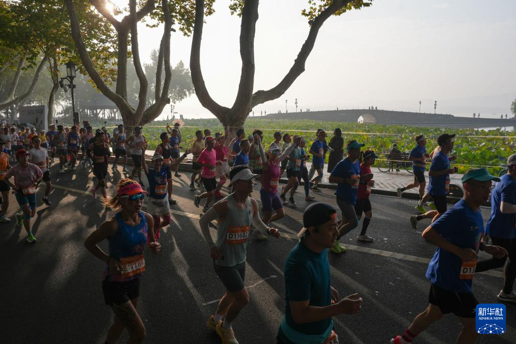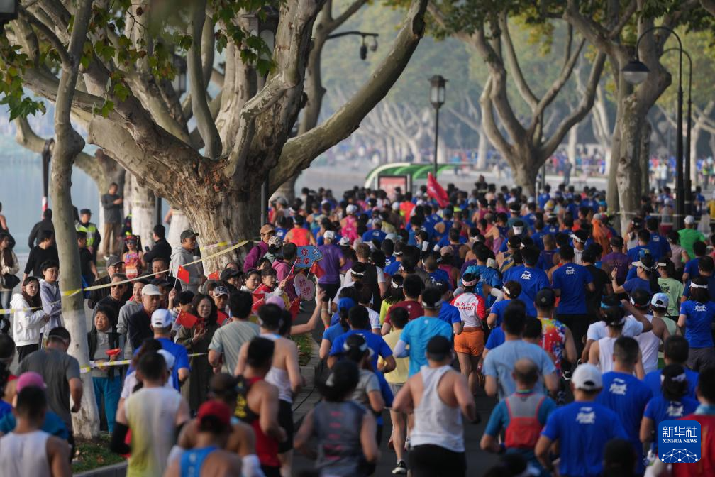 11月2日,参赛选手在比赛中经过西湖景区北山街。