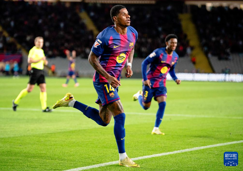 11月2日,巴塞罗那队球员拉什福德在比赛中庆祝进球。