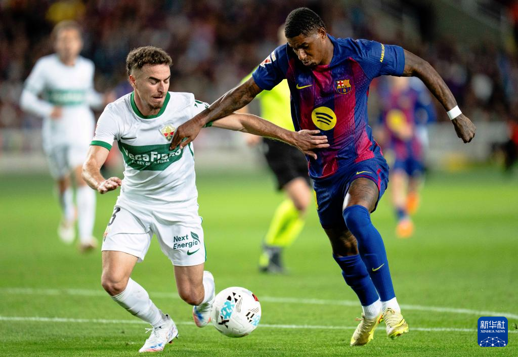 11月2日,巴塞罗那队球员拉什福德(右)与埃尔切球员佩德罗萨在比赛中对抗。