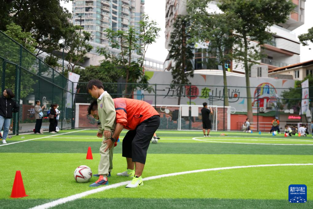 11月3日,在广州市越秀区大东街的均益球场,教练在教小朋友踢球。