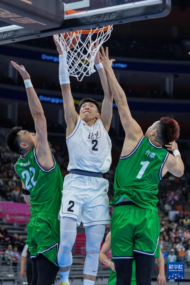 11月6日,北京队球员廖三宁(中)在比赛中突破上篮。