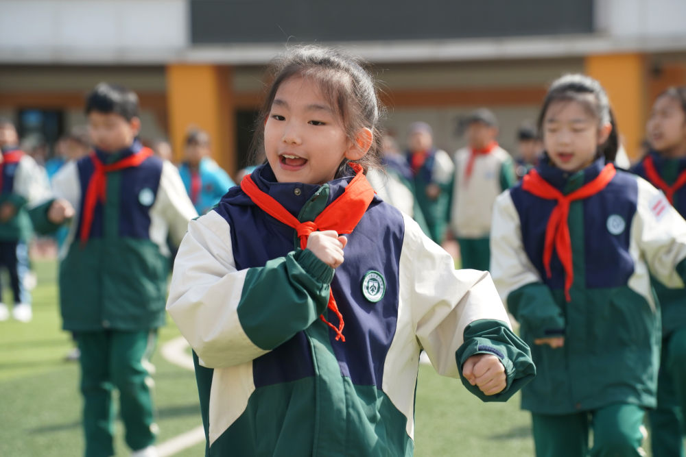 3月21日,在西安市曲江第六小学,学生在阳光体育大课间活动上练习“五禽操”。新华社记者 邵瑞 摄